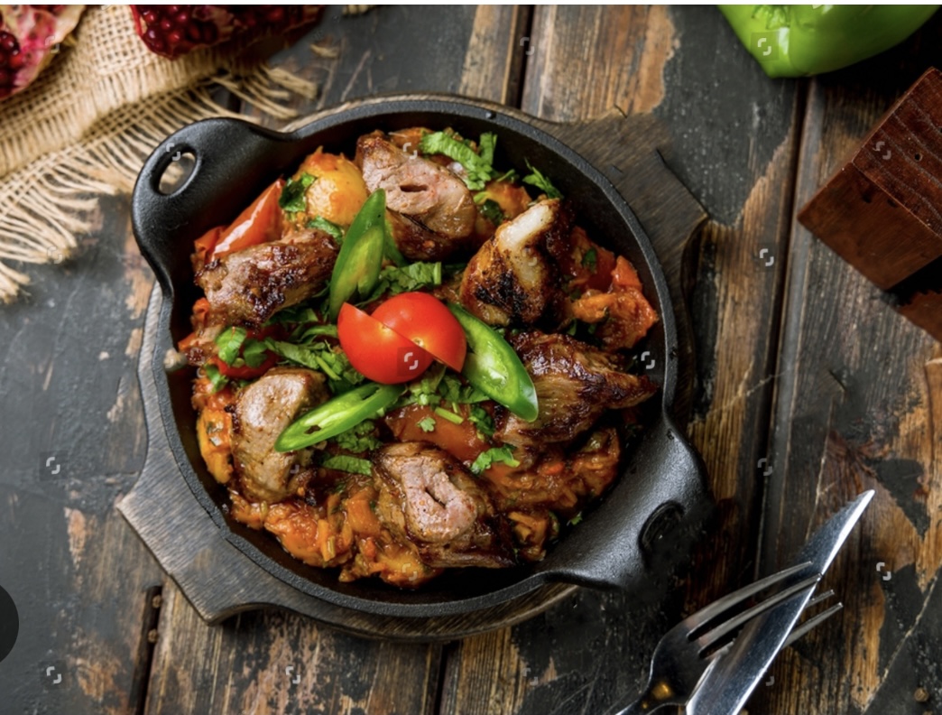 The traditional Georgian beef stew features tender beef stewed with seasoned vegetables.